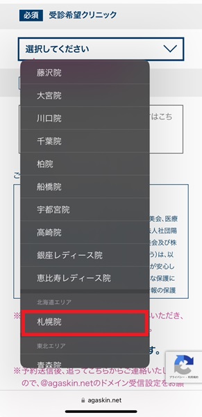 受診する院を選択する項目で「AGAスキンクリニック札幌院」を選んでそのまま進み完了します。