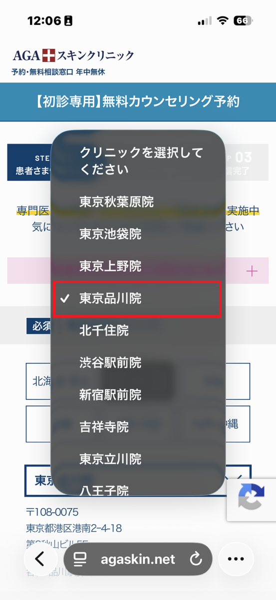 受診する院を選択する項目で「AGAスキンクリニック東京品川院」を選んでそのまま進み完了します。