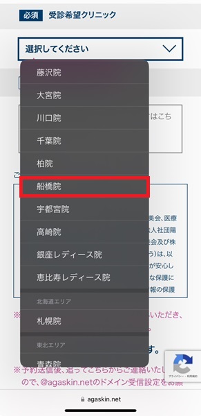 受診する院を選択する項目で「AGAスキンクリニック船橋院」を選んでそのまま進み完了します。