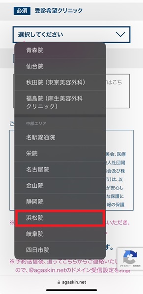 受診する院を選択する項目で「AGAスキンクリニック浜松院」を選んでそのまま進み完了します。