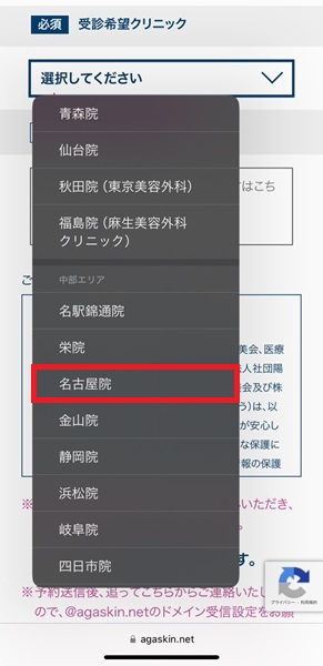 受診する院を選択する項目で「AGAスキンクリニック名古屋院」を選んでそのまま進み完了します。