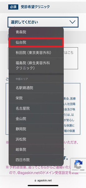 受診する院を選択する項目で「AGAスキンクリニック仙台院」を選んでそのまま進み完了します。
