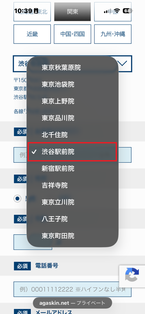 受診する院を選択する項目で「AGAスキンクリニック渋谷駅前」を選んでそのまま進み完了します。