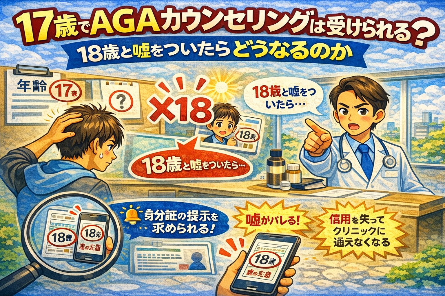 「17歳で今年18歳になります。薄毛が気になっていて、AGAのカウンセリングを受けようと思っています。でも“18歳未満は不可”と書いてありました。18歳と嘘をついたらどうなりますか?」
